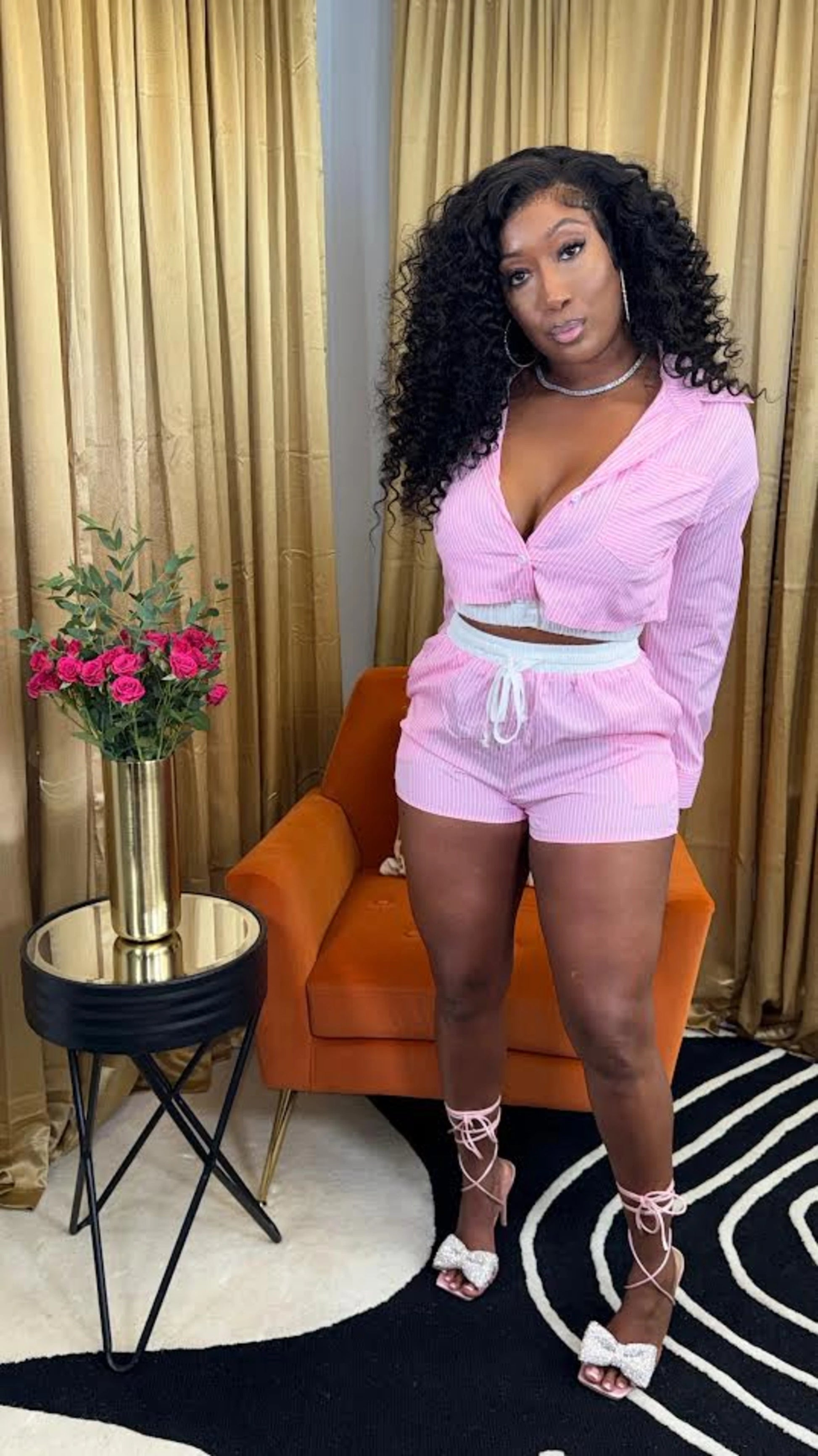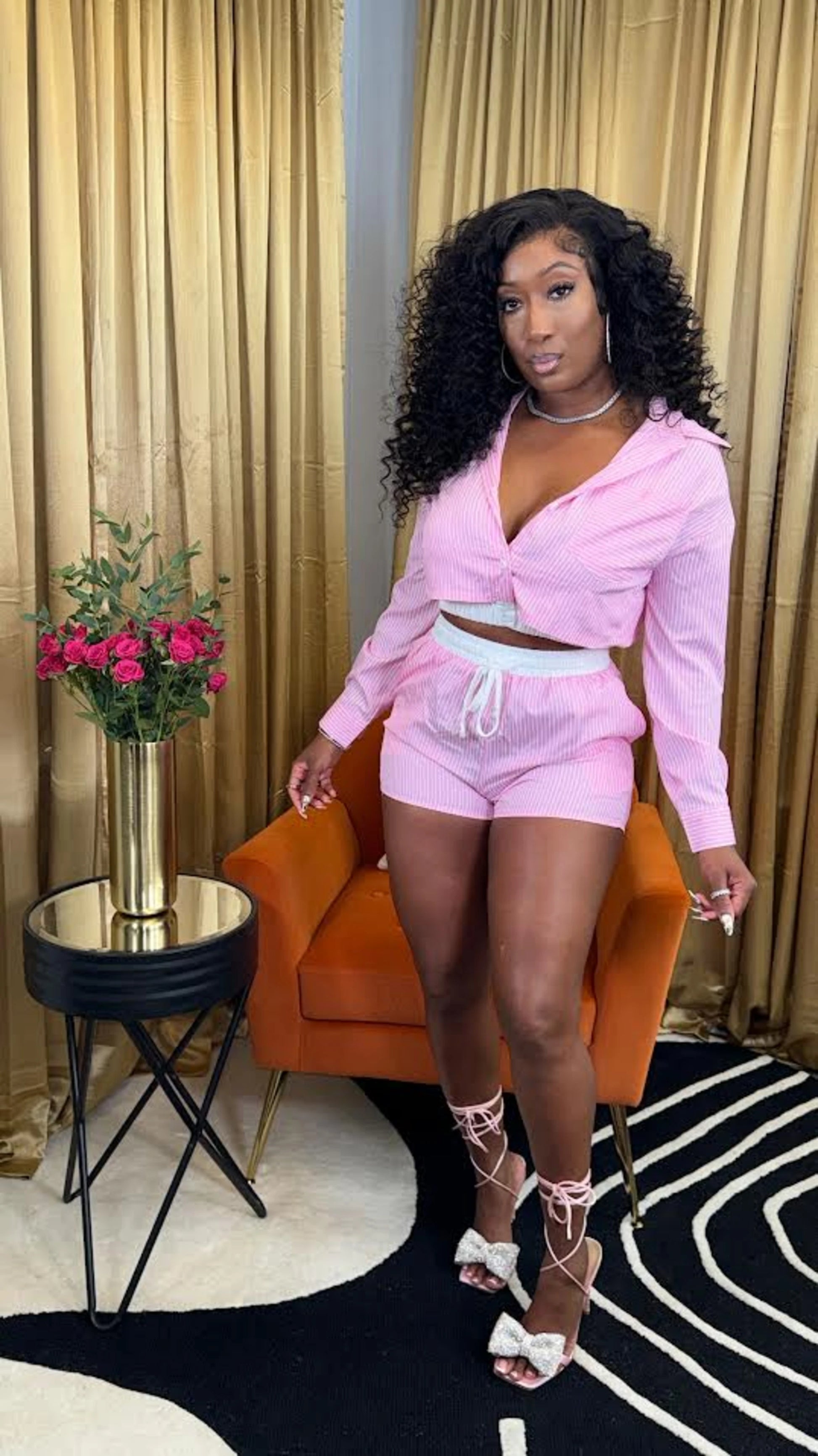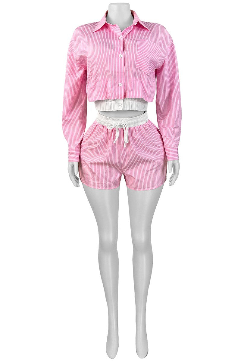 This isn’t your average two-piece — the Bossy In Stripes Set is playful, polished, and made for soft girls who know they still run the show. With classic pinstripes, a cropped button-up blouse, and matching high-waisted drawstring shorts, this fit is where comfort meets clean girl confidence.